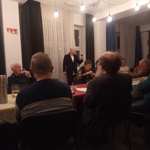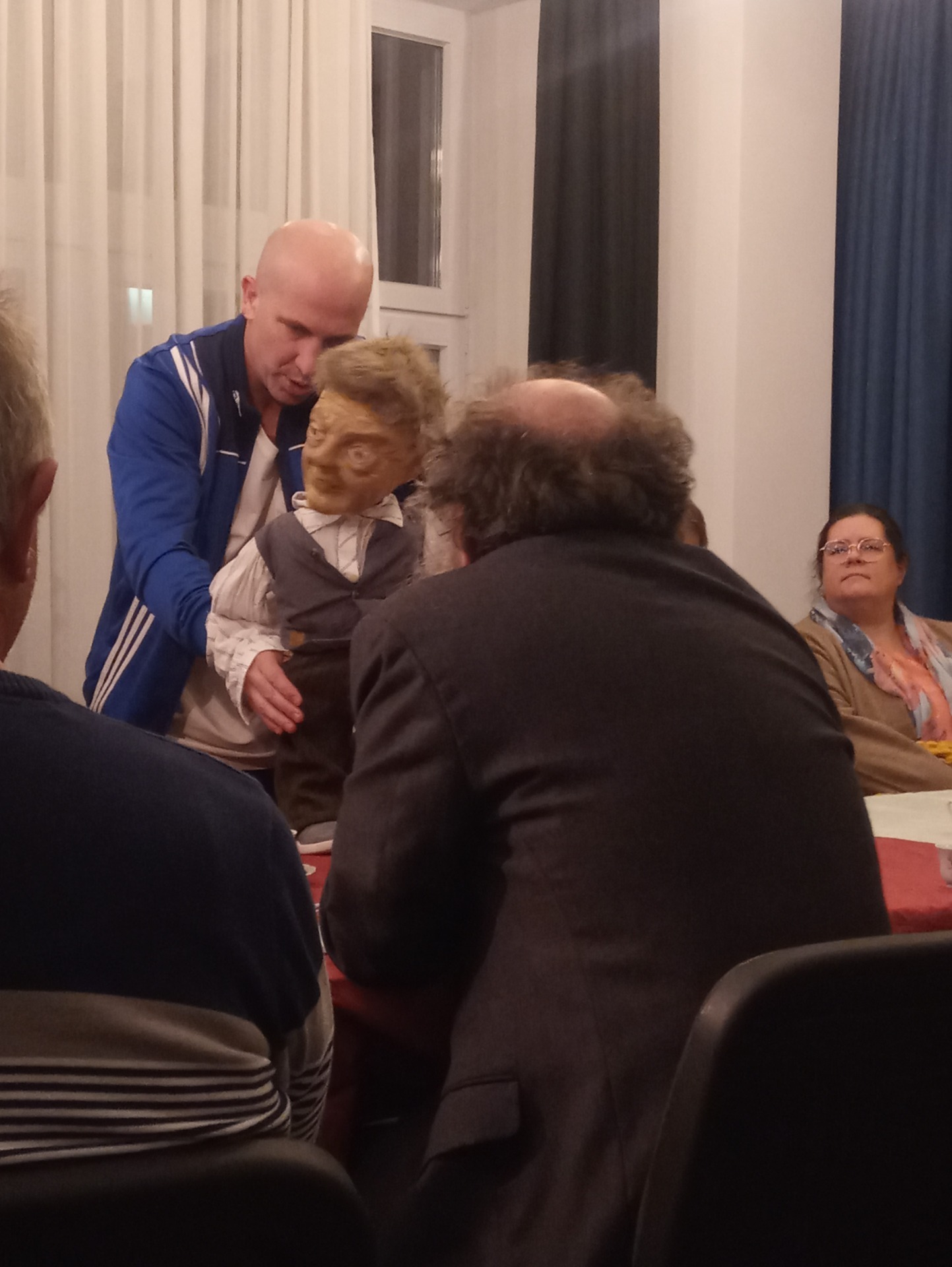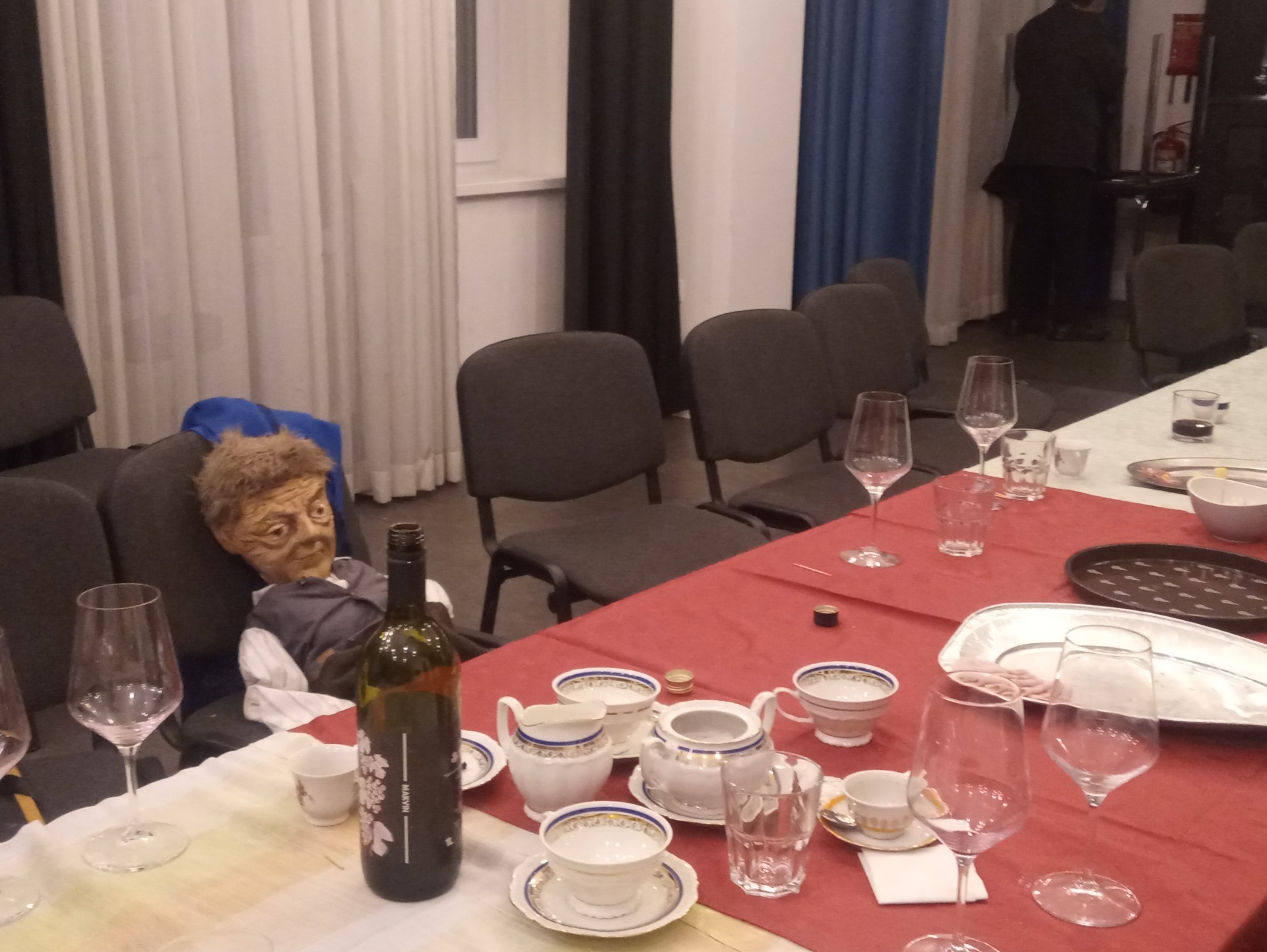 Redko kdaj se zgodi, da se abonenti Maistrovega abonmaja znajdemo na predstavi v Klubu kulturnega doma v Kamniku, še redkeje, če se znajdemo tam za skupno mizo, pogrnjeno z različnimi narezki v družbi znanih kulturnikov. Prav to se je zgodilo 5. in 7. novembra v dveh večernih terminih, ko smo prisostvovali namizni družinski drami z naslovom Kdo je okužil dedka?, ki so jo zasnovali člani Kulturno-umetniškega društva LJUD, znani po uličnih predstavah Invazija in Pocestnica, s katerima so pred leti gostovali v Kamniku. Tokrat so se odločili, da se umaknejo z ulic v zavetje kulturnega hrama in nas s kvalitetnim vinom ter prigrizki omehčajo do te mere, da izpovemo resnične zgodbe, ki so se nam dogajale v času korone. Marsikdo med nami je namreč tekel pred trgovkami in redarji, ker si ni pravočasno nadel maske ali pokazal PCR izvida, recitiral poštevanko ali Podvodnega moža, da bi se mu po 12. letu za hip odprla vrata konzumerizma, trpel družinsko izolacijo, ker je brez ustrezne napovedi in priprav obiskal babico ali dedka, se iz šole in službe odpravil domov še preden se je delovni dan začel, ker je bil test za korono pozitiven in še bi lahko naštevali… Obdobje korone je razkrilo številne frustracije in travme, ki so znotraj družin že tlele pod navidezno mirnim površjem, a jih je epidemija Covida-19 ustrezno prignala na razburkano gladino, kjer so se razbohotile v vsej svoji veličini. Člani KUD-a Ljud so zadnja leta pridno beležili zgodbe prijateljev, znancev, obiskovalcev predstav in mimoidočih, ter jih s pomočjo antropologinje Sanje Žmavc analizirali ter “predelali” v izviren tekst, ki na duhovit način opisuje dostikrat absurdne situacije, ki so pripeljale do tragikomičnih dialogov in iskanja diplomatskih rešitev, pri katerih sta si volk in ovca izmenično podajala svoja oblačila.