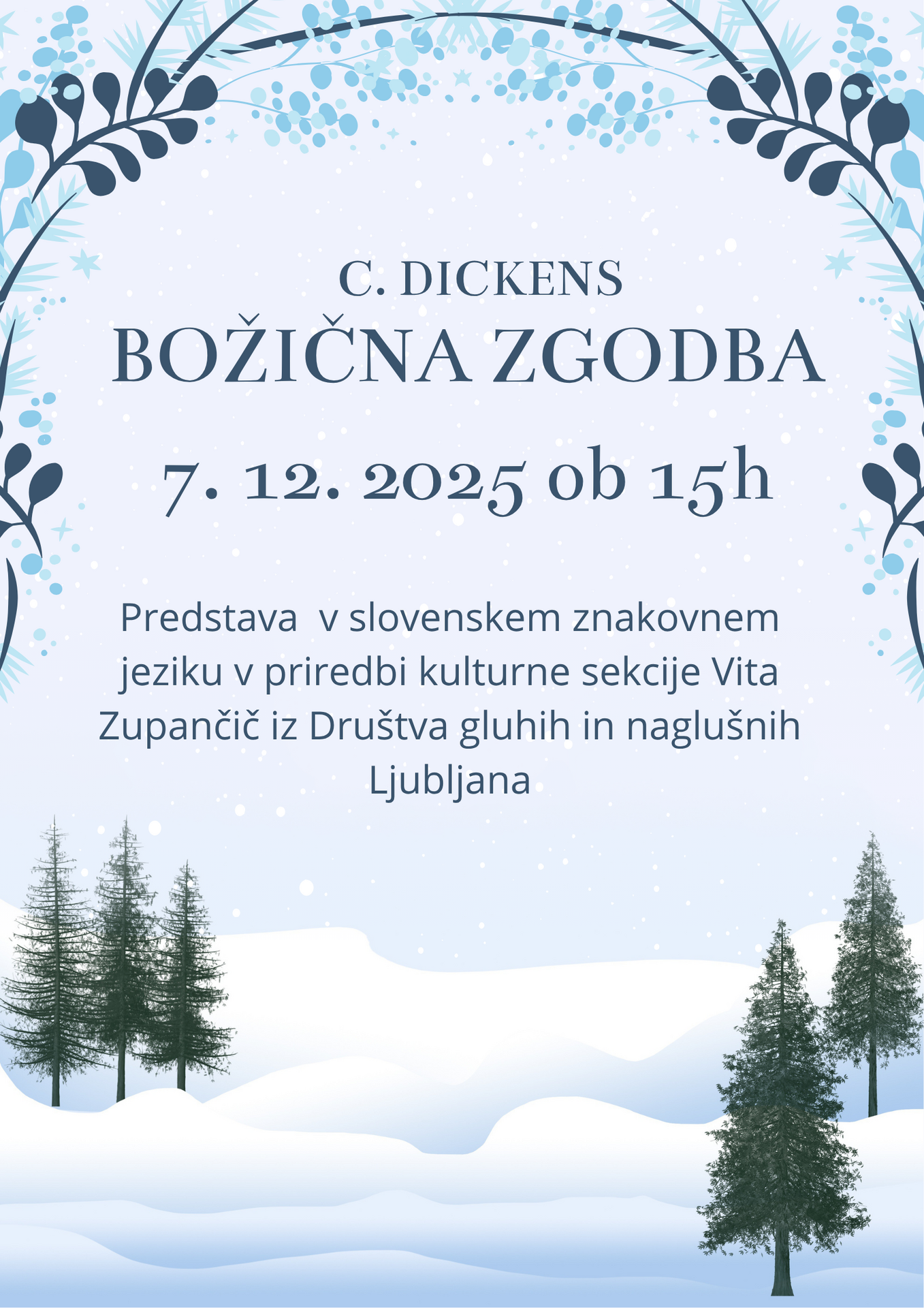 V nedeljo 7. decembra, ob 15.00 vabljeni v Dom Kulture Kamnik, kjer bo prvič v slovenskem znakovnem jeziku predstavljena priredba pravljice Božična pesem. Po predstavi bo otroke obdaroval Dedek Mraz. Za simbolična darila bo poskrbelo Društvo gluhih in naglušnih Ljubljana. Starše zato naprošamo, da ne prinašajo svojih daril.