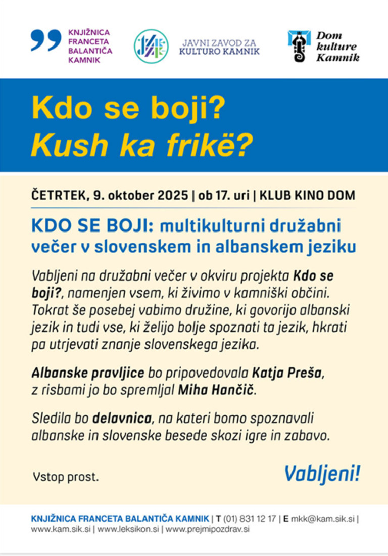 Vabljeni na družabni večer v okviru projekta Kdo se boji?, namenjen vsem, ki živimo v kamniški občini. Tokrat še posebej vabimo družine, ki govorijo albanski jezik in tudi vse, ki želijo bolje spoznati ta jezik, hkrati pa utrjevati znanje slovenskega jezika.