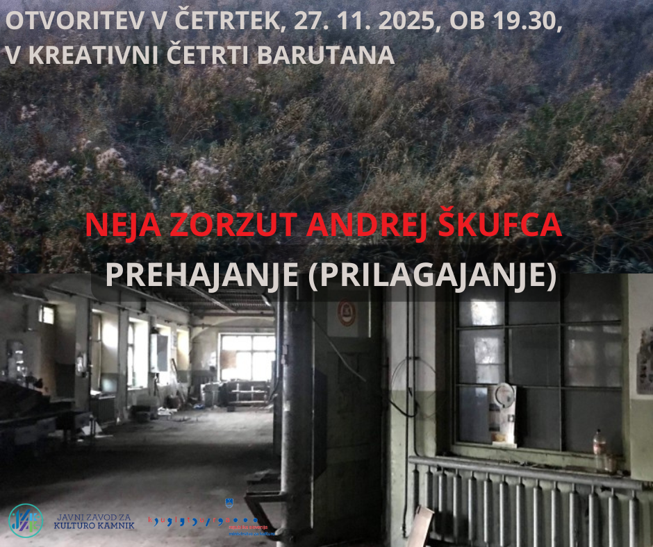 V okviru javnega poziva Ministrstva za kulturo Republike Slovenije za kroženje kulturnih vsebin, vabimo na razstavo dveh umetnikov mlajše generacije - Neje Zorzut in Andreja Škufce, rezidentov, ki ustvarjata v Kreativni četrti Barutana.
